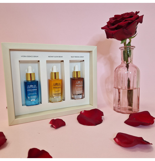 Gold Collagen pilnas kosmetikos rinkinys (balzamas + veido kaukės + 3 serumai)