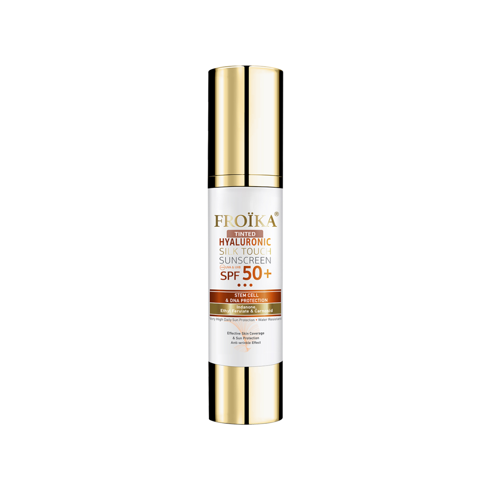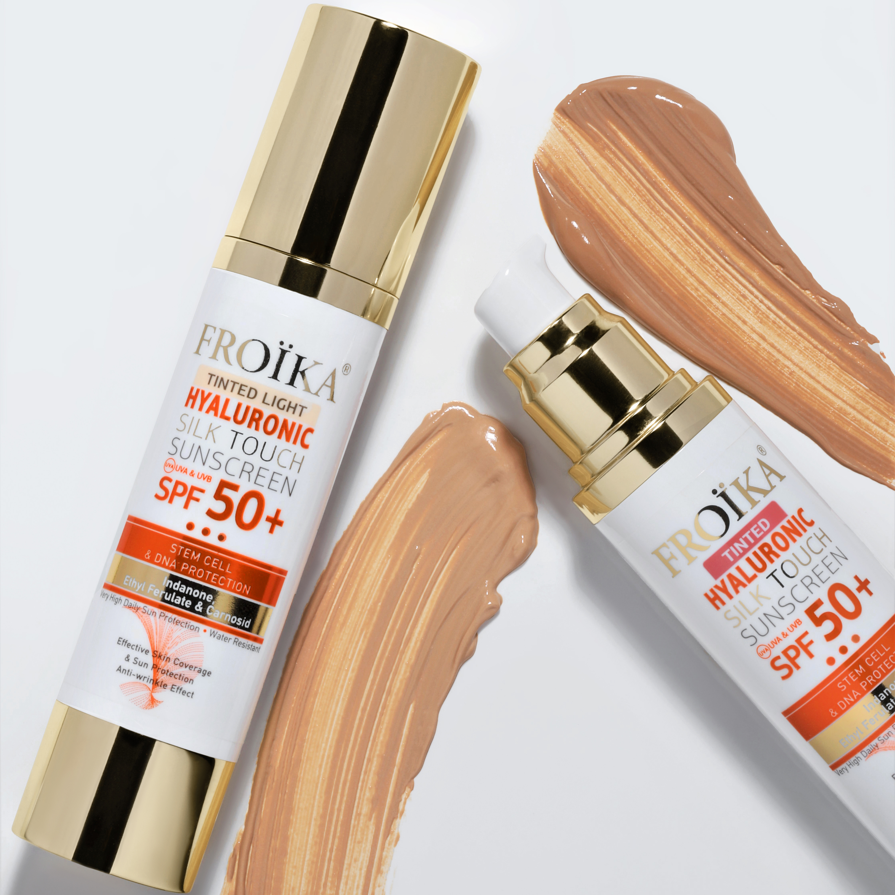 Apsauginis kremas nuo saulės SPF 50+ TINTED apsauginis kremas su atspalviu (FROIKA hyaluronic Silk Touch SPF 50+ TINTED, 50ml). Itin aukštos apsaugos SPF50+ toninis veido kremas sukurtas kasdienei apsaugai nuo saulės, užtikrina plataus spektro UVA ir UVB filtravimą. Lengva tekstūra tolygiai pasiskirsto ant odos, suteikia šilkinį matinį efektą ir padeda vizualiai glotninti odos paviršių. Formulė praturtinta hialurono rūgštimi, kuri palaiko odos drėgmės balansą, bei antioksidantais (vitaminu E, Indanone, Ethyl Ferulate), padedančiais apsaugoti odą nuo neigiamo aplinkos poveikio. Tonuotas atspalvis padeda suvienodinti odos atspalvį, maskuoja spalvos netolygumus, paraudimus ir suteikia sveiką, estetišką išvaizdą. Puikiai tinka naudoti vietoje makiažo pagrindo.