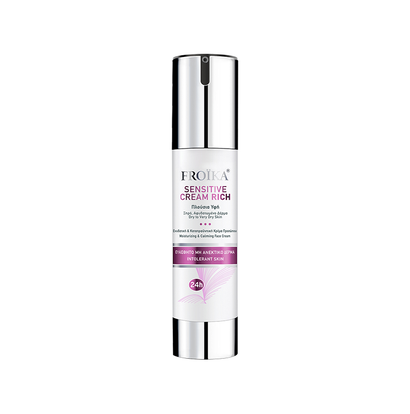 FROIKA sodrios tekstūros raminamasis ir intensyviai drėkinamasis veido kremas jautriai odai (FROIKA Sensitive Cream Rich, 50 ml). Sukurtas jautriai odai, kuriai reikalingas didesnis komfortas, maitinimas ir ilgalaikis drėkinimas. Turtinga, apgaubianti tekstūra padeda sumažinti tempimo pojūtį, suteikia odai minkštumo ir palaiko jos komfortą visą dieną. Kremas ypač tinka tuomet, kai oda jaučia sausumą, diskomfortą ar tampa jautresnė dėl aplinkos veiksnių.